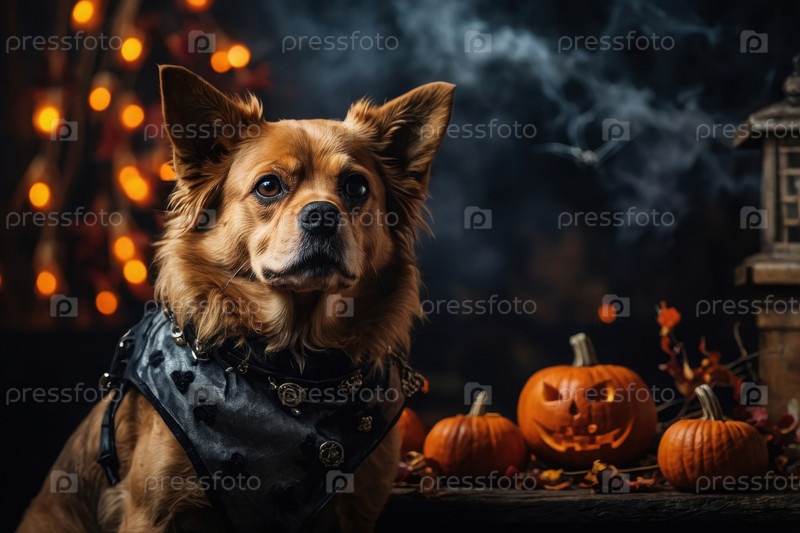 AI Generative Cute Fluffy Dog одет как ведьма на темном, пугающем тыквенном фоне