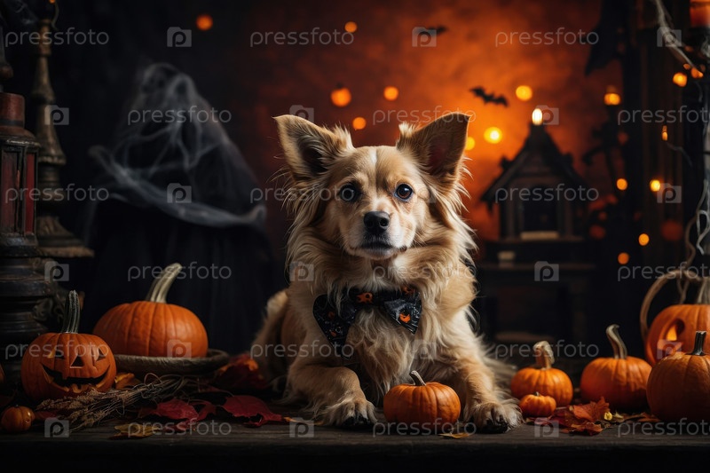 AI Generative Cute Fluffy Dog одет как ведьма на темном, пугающем тыквенном фоне