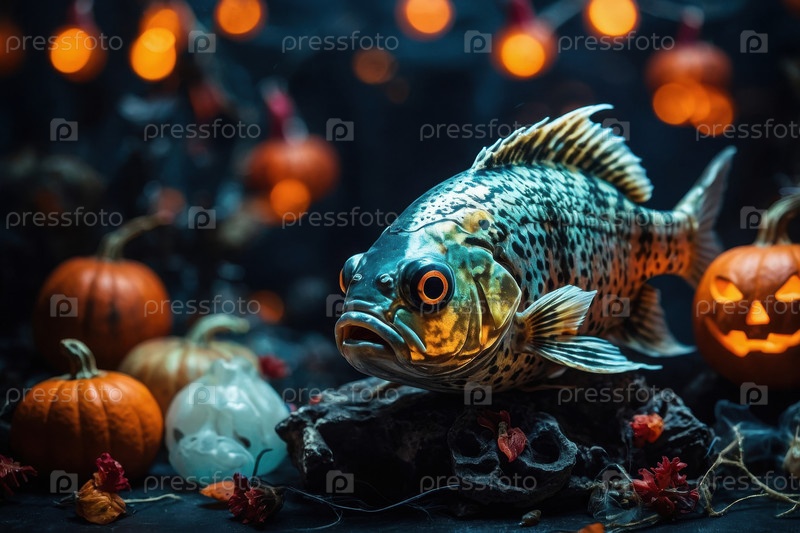 ИИ-генерирующая морская рыба на страшном темном фоне из оранжевой тыквы для Хэллоуина