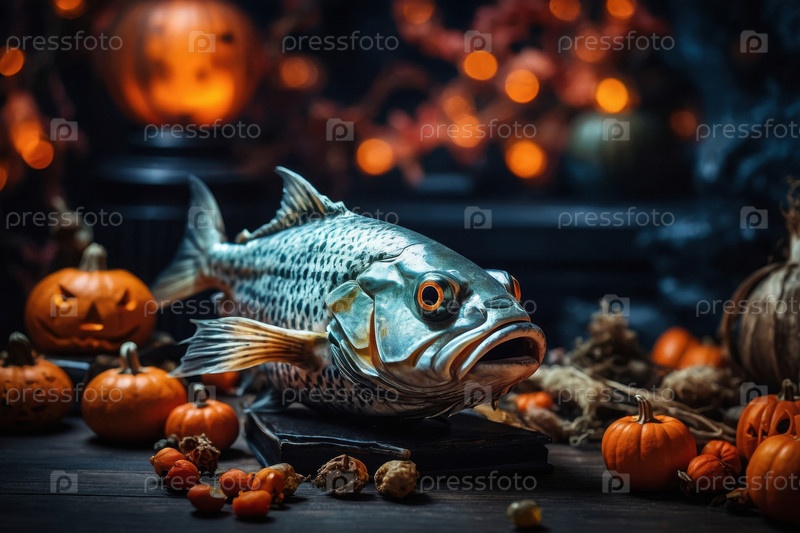 ИИ-генерирующая морская рыба на страшном темном фоне из оранжевой тыквы для Хэллоуина