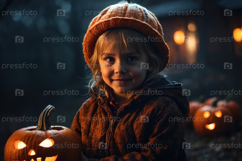 Ребёнок держит в руках тыквенный фонарь среди страшных пейзажей Хэллоуина