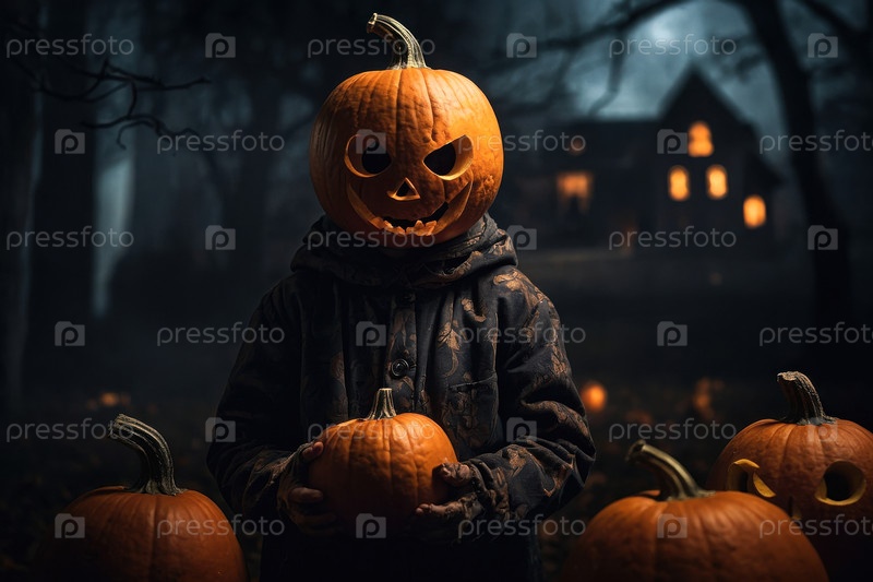 Генеративный мужчина с тыквой вместо головы на Хэллоуине пугающий фон леса