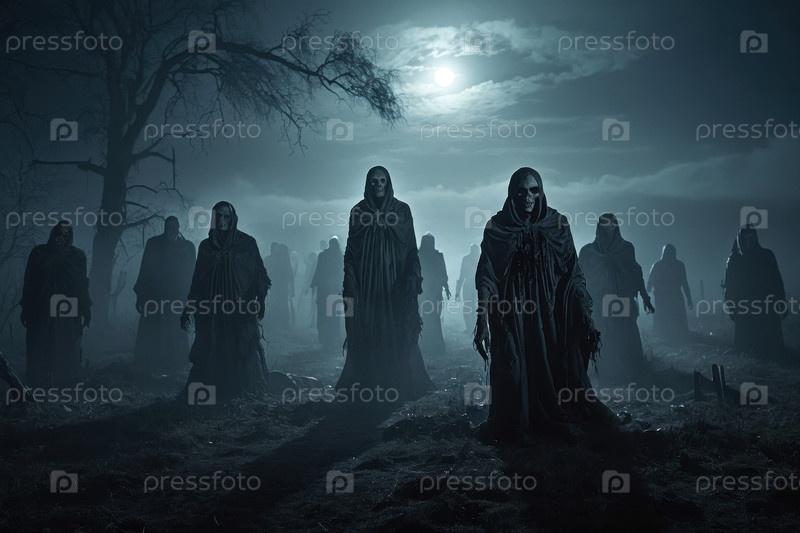 Силуэты зомби, движущиеся по кладбищу на ужасающем фоне ночи Хэллоуина
