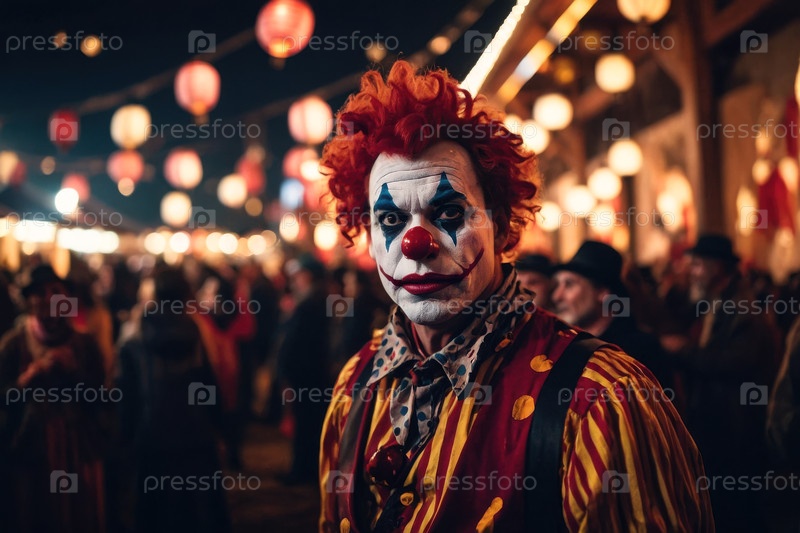 Клоун-мужчина на карнавале Хэллоуина с размытыми людьми на заднем плане