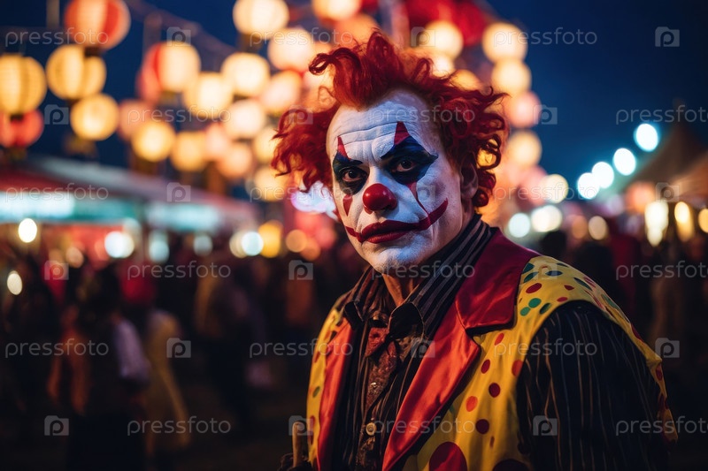 Клоун-мужчина на карнавале Хэллоуина с размытыми людьми на заднем плане