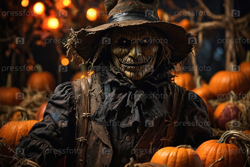 Страшный боги на ферме с тыквой пугает Хэллоуина Ворон AI Generative