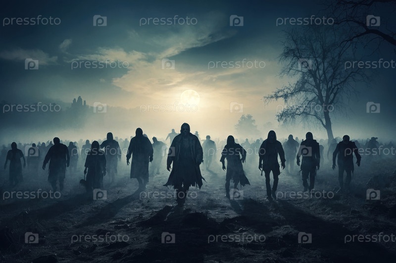 Силуэты зомби перемещаются на кладбище в страшную ночь Хэллоуина