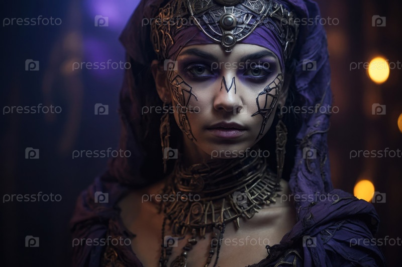 Молодая женщина в костюме зомби-фараона на тёмном страшном фоне