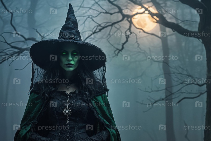 Генеративная молодая женщина, одетая в черную ведьму на фоне темного лесного фона