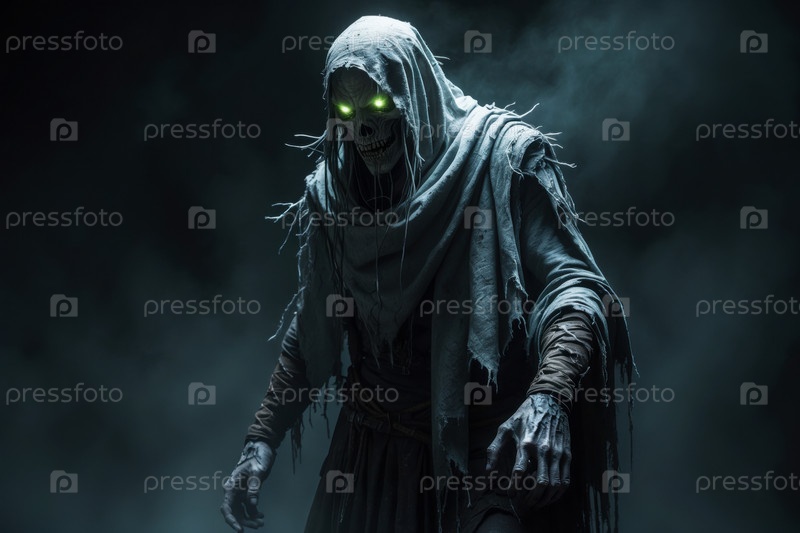 Страшный костюм скелета Хэллоуина на фоне темного тумана AI Generative background
