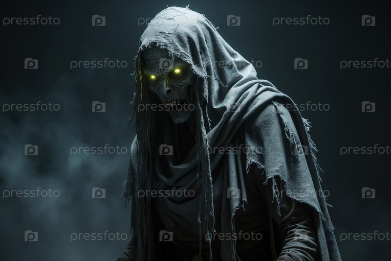Человек, генерирующий ИИ в пугающем костюме скелета Хэллоуина на тёмном туманном фоне