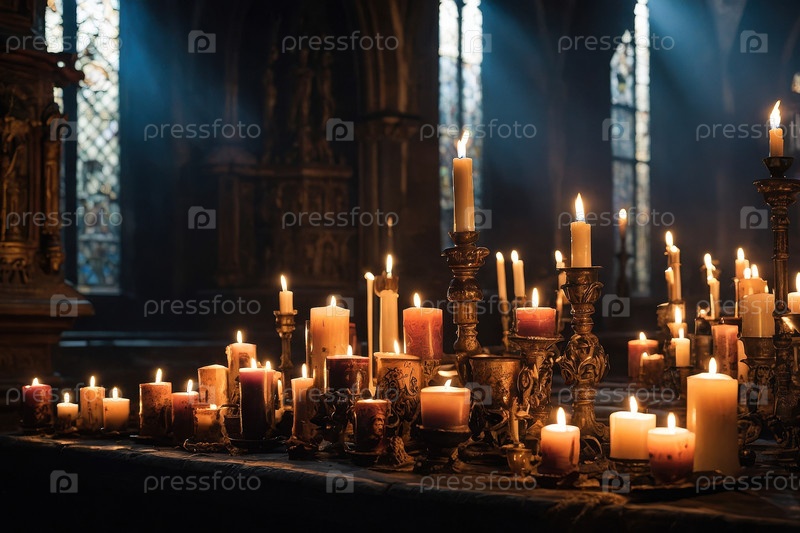 Алтарь церкви с горящими декоративными свечами для празднования Дня всех святых