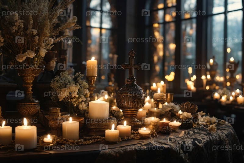 Алтарь церкви с горящими декоративными свечами для празднования Дня всех святых