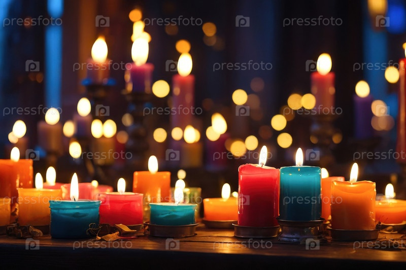 Алтарь церкви с горящими декоративными свечами для празднования Дня всех святых