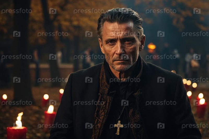 Пожилой мужчина в День всех святых в украшенных церковных огнях ИИ генеративная свеча
