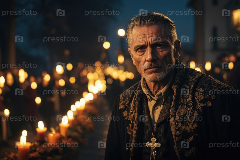 Генеративный мужчина пожилой человек в ночь на День всех святых в церкви, украшенной горящими свечами