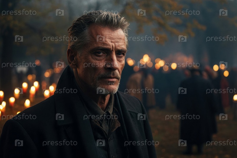 Генеративный мужчина пожилой человек в ночь на День всех святых в церкви, украшенной горящими свечами