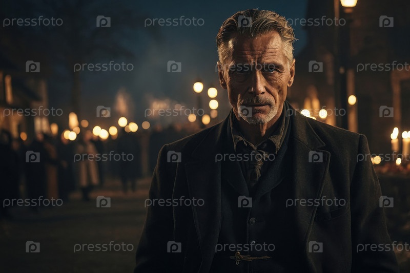 Генеративный мужчина пожилой человек в ночь на День всех святых в церкви, украшенной горящими свечами