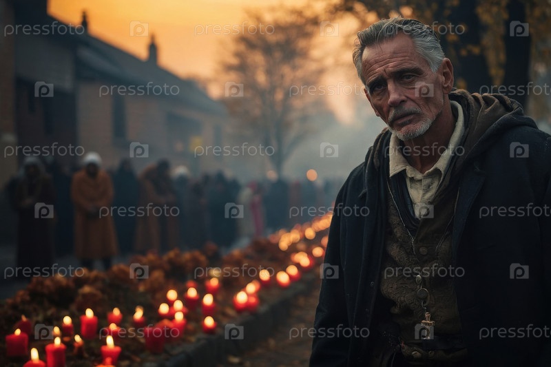 Генеративный мужчина пожилой человек в ночь на День всех святых в церкви, украшенной горящими свечами