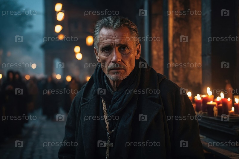 Генеративный мужчина пожилой человек в ночь на День всех святых в церкви, украшенной горящими свечами