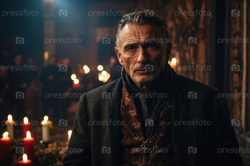 Генеративный мужчина пожилой человек в ночь на День всех святых в церкви, украшенной горящими свечами
