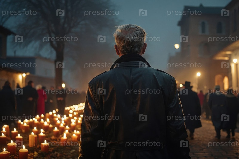 Генеративный мужчина пожилой человек в ночь на День всех святых в церкви, украшенной горящими свечами