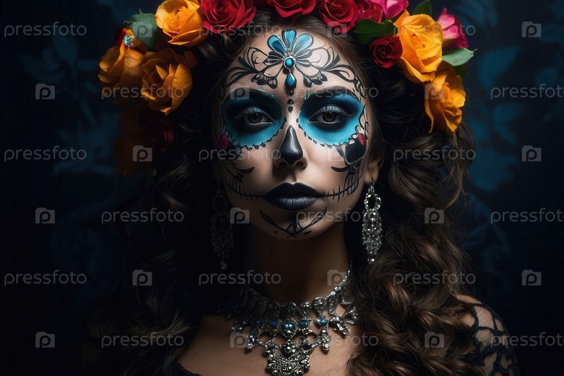 Молодая женщина День мертвых Костюм и макияж Día de los Muertos AI Generative