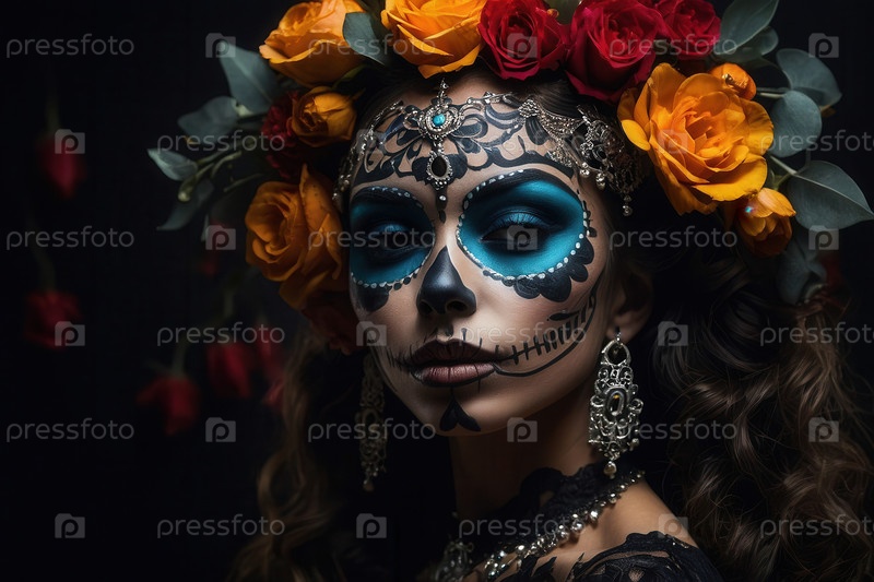 Молодая женщина День мертвых Костюм и макияж Día de los Muertos AI Generative