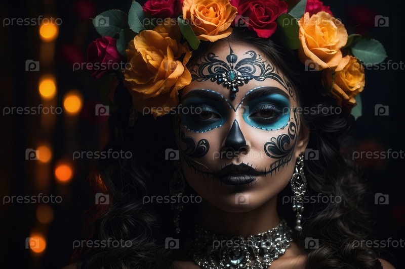 Молодая женщина День мертвых Костюм и макияж Día de los Muertos AI Generative