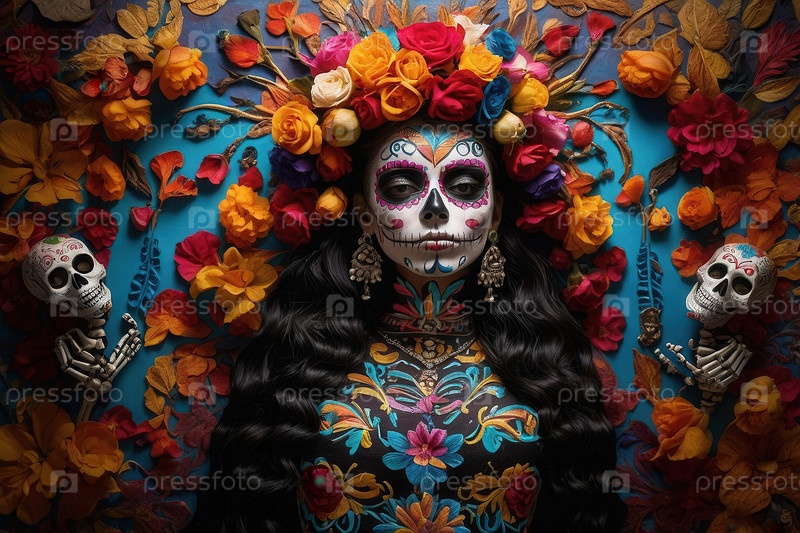Молодая женщина День мертвых Костюм и макияж Día de los Muertos AI Generative