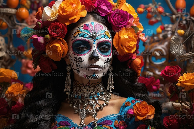 Молодая женщина День мертвых Костюм и макияж Día de los Muertos AI Generative