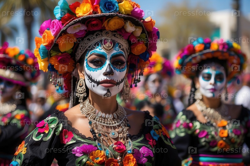 Молодая женщина День мертвых Костюм и макияж Día de los Muertos AI Generative