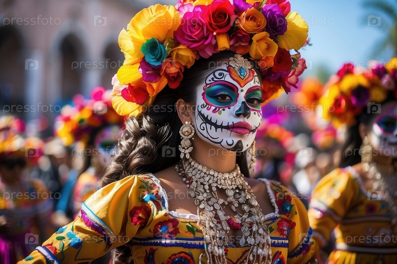 Молодая женщина День мертвых Костюм и макияж Día de los Muertos AI Generative