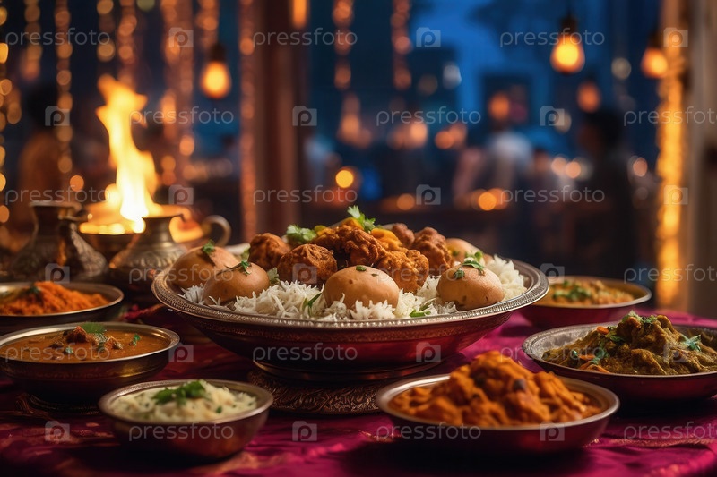 Дивали традиционные индийские блюда из карри, риса и сладостей, декоративный фон AI Generative