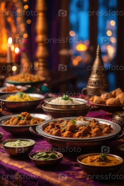 Дивали традиционные индийские блюда из карри, риса и сладостей, декоративный фон AI Generative