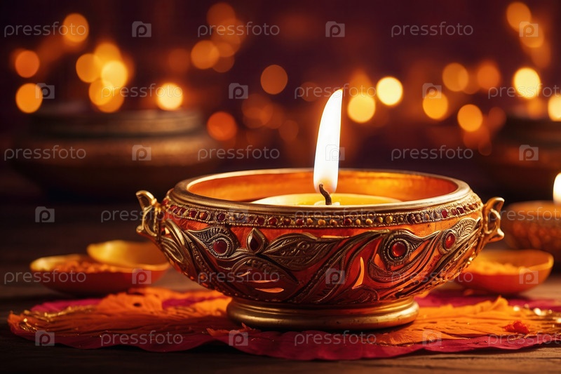 Генеративные красочные украшения Дивали с традиционными свечами, масляными лампами, яркими цветами и декоративными мисками
