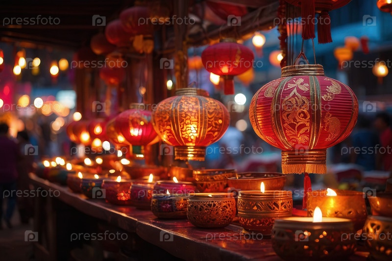 Производительные красочные украшения Дивали с традиционными свечами, масляными лампами, яркими цветами и декоративными мисками копируют пространство