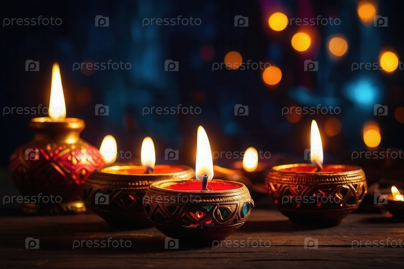 Производительные красочные украшения Дивали с традиционными свечами, масляными лампами, яркими цветами и декоративными мисками копируют пространство