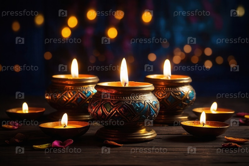 Производительные красочные украшения Дивали с традиционными свечами, масляными лампами, яркими цветами и декоративными мисками копируют пространство