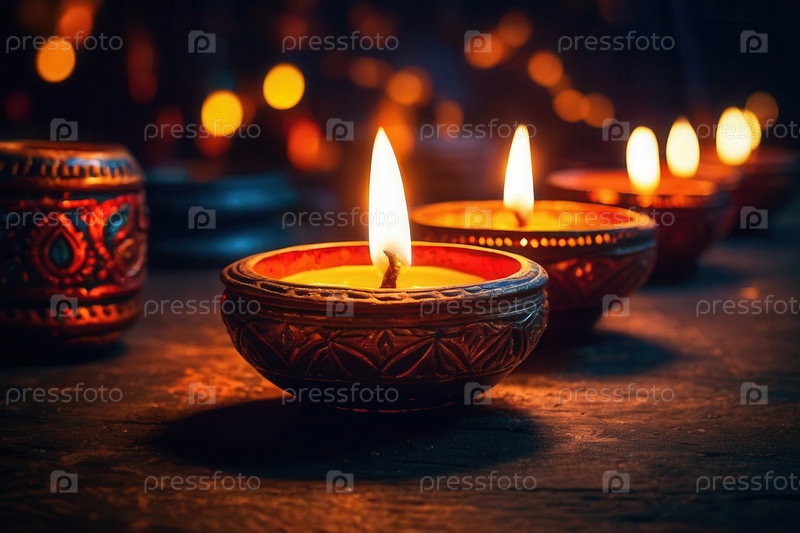 Производительные красочные украшения Дивали с традиционными свечами, масляными лампами, яркими цветами и декоративными мисками копируют пространство