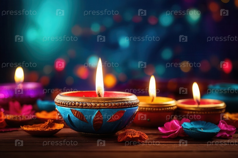 Генеративные красочные украшения Дивали с традиционными свечами, масляными лампами, яркими цветами и декоративными мисками
