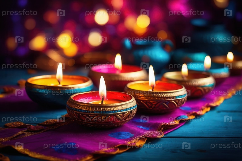 Генеративные красочные украшения Дивали с традиционными свечами, масляными лампами, яркими цветами и декоративными мисками