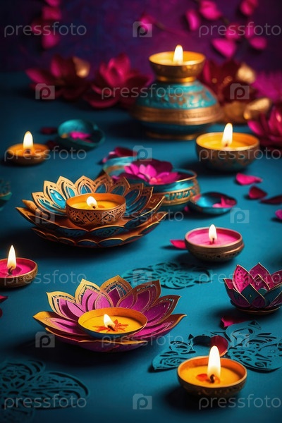 Генеративные красочные украшения Дивали с традиционными свечами, масляными лампами, яркими цветами и декоративными мисками