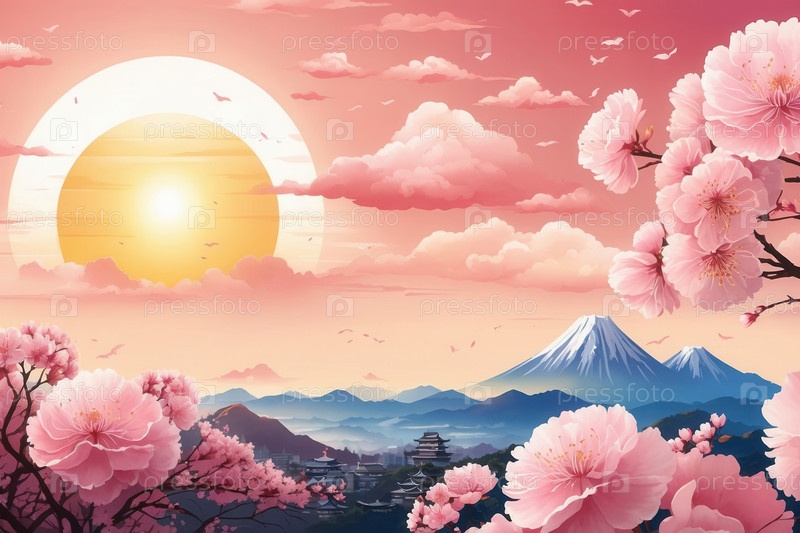 Генеративная туристическая открытка с японским фоном копирует космические горы, вишневые цветки, архитектуру и природу