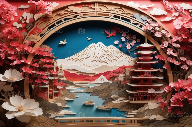 Генеративная туристическая открытка с японским фоном копирует космические горы, вишневые цветки, архитектуру и природу