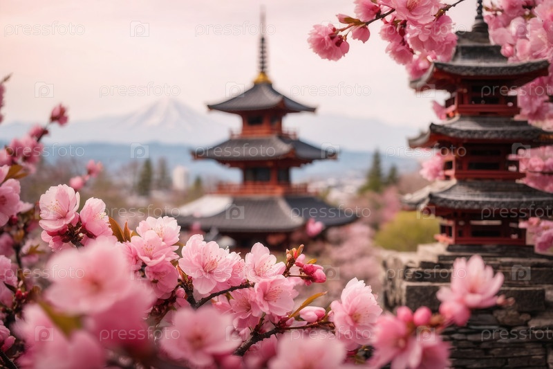 Открытка Япония фоновая копия космической горы, вишневых цветов, архитектуры и природы AI Generative