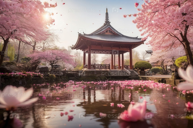 Генеративная туристическая открытка с японским фоном копирует космические горы, вишневые цветки, архитектуру и природу