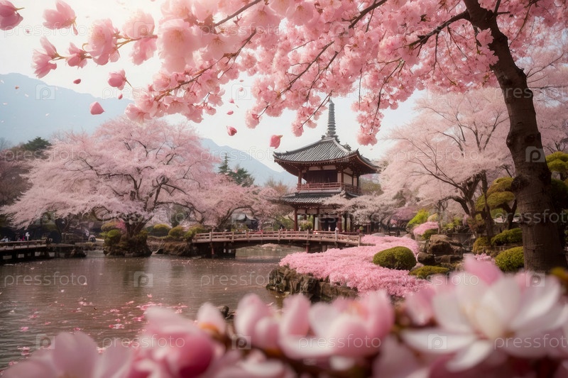 Генеративная туристическая открытка с японским фоном копирует космические горы, вишневые цветки, архитектуру и природу
