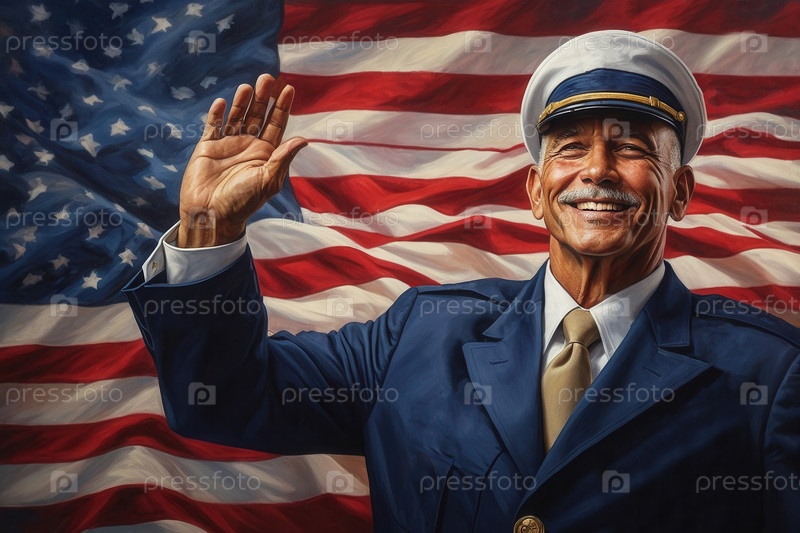 Мужчина в военной форме приветствует на фоне флага США День ветеранов
