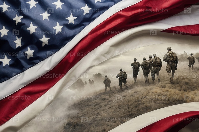 Молодые американские военные в форме на фоне флага США В День памяти ветеранов